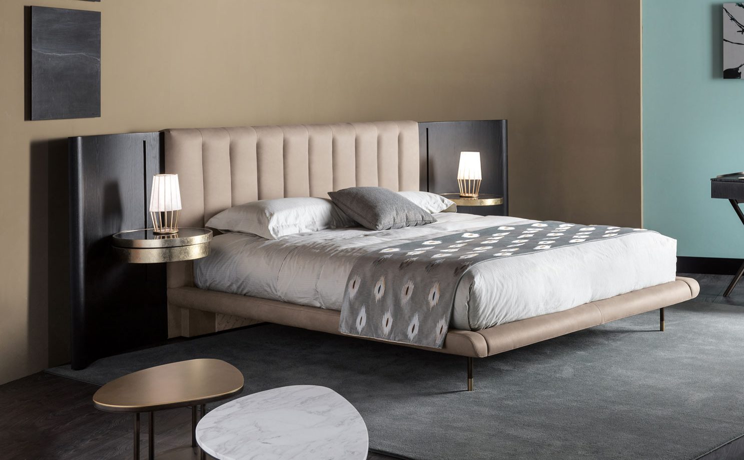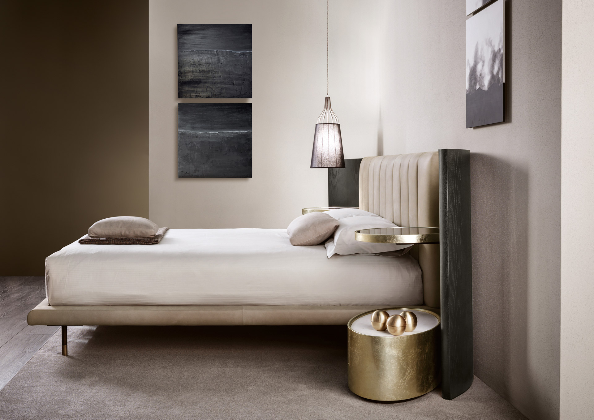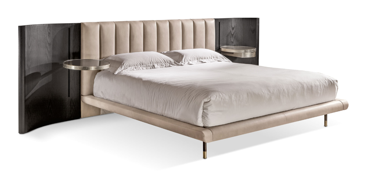 Introducing Mirage, a cozy integrated double bed system designed to enhance your comfort. The internal structure is crafted from multilayer wood, solid poplar, and beech, while the structural covering features non-deformable polyurethane foam and a synthetic layer. The wide headboard, made of veneered wood, surrounds the entire structure in a comforting embrace. The upholstery for both the headboard and bed frame can be customized in fabric, leather, or eco-leather. Notably, the two support surfaces are designed for easy use, thanks to their ability to rotate.