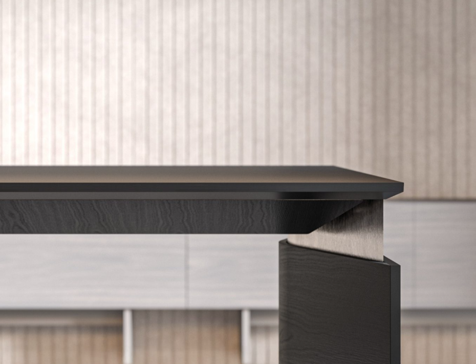 Move & Lead executive office furniture system combines the best in ergonomics and cutting-edge technology and is designed for active leaders. The system includes an adjustable desk and matching bookcases, cabinets, and shelves, creating a cohesive, professional, and highly functional workspace, all comes with luxury Materials and Finishes: Available in HPL Fenix finishes, with options for natural oak, ash, or walnut veneer, complemented by polished stainless steel, Move & Lead embodies subtle luxury and timeless design.