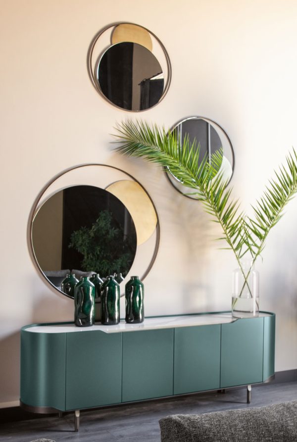 Rodin, designed by Sante Cantori, features a round mirror with a frame composed of two intertwined steel bands that create a circular design encasing the mirror, which is supported by a wooden structure.
