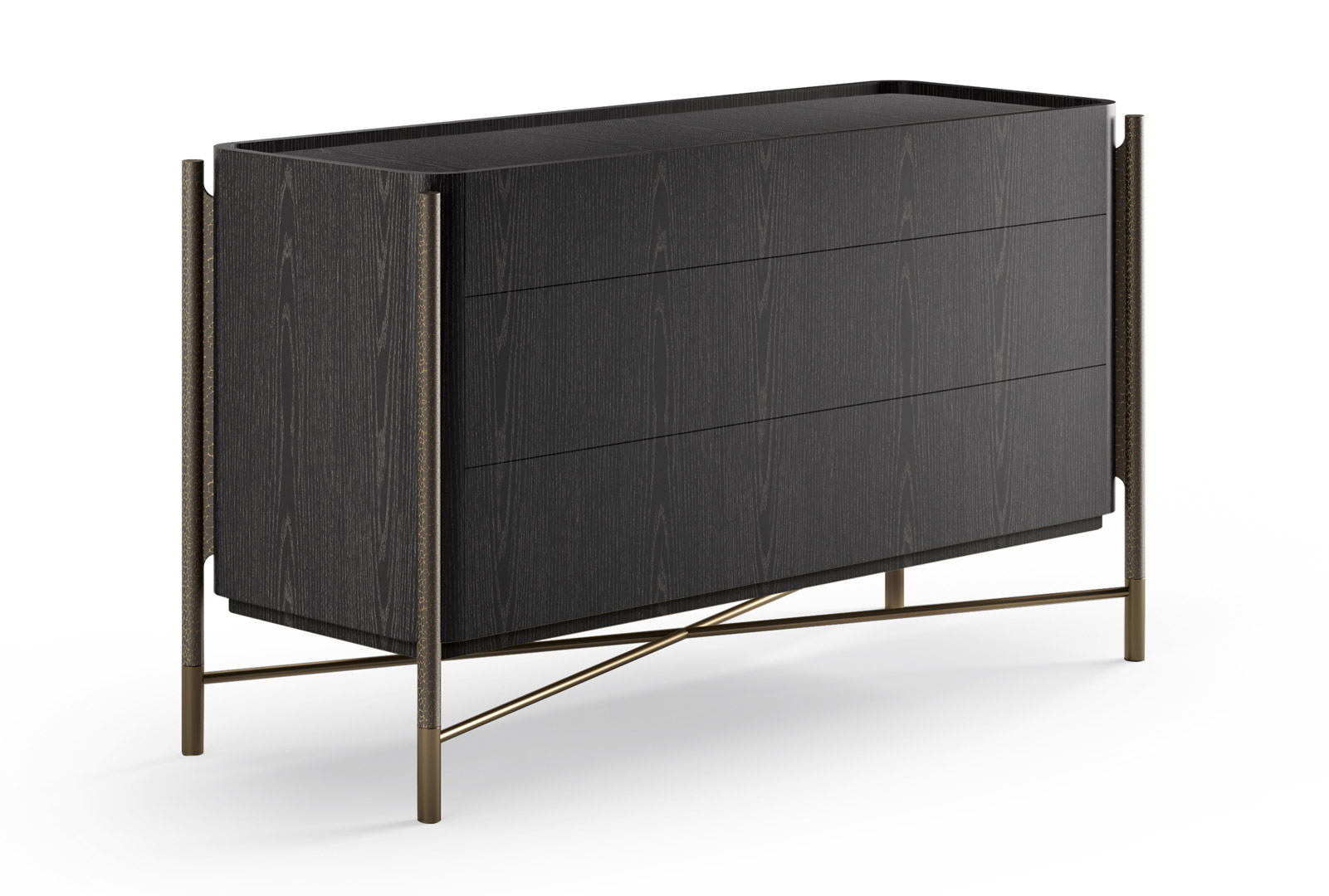 The Shanghai chest of drawers , designed by Maurizio Manzoni, features a base that extends into cylindrical supports made of solid and forged iron, complemented by metal ends in contrasting finishes. The structure is crafted from wood and includes soft-close drawers. Its essential and modern lines make it a striking piece that can stand out in any setting.