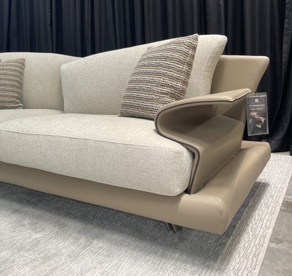 Super Roy is a unique sofa with a diagonal seat and back cushion cut. It features overlapping curved backs, providing two different seating depths for enhanced comfort. Compositions, Fabric Swatches, and sizes are available upon request.